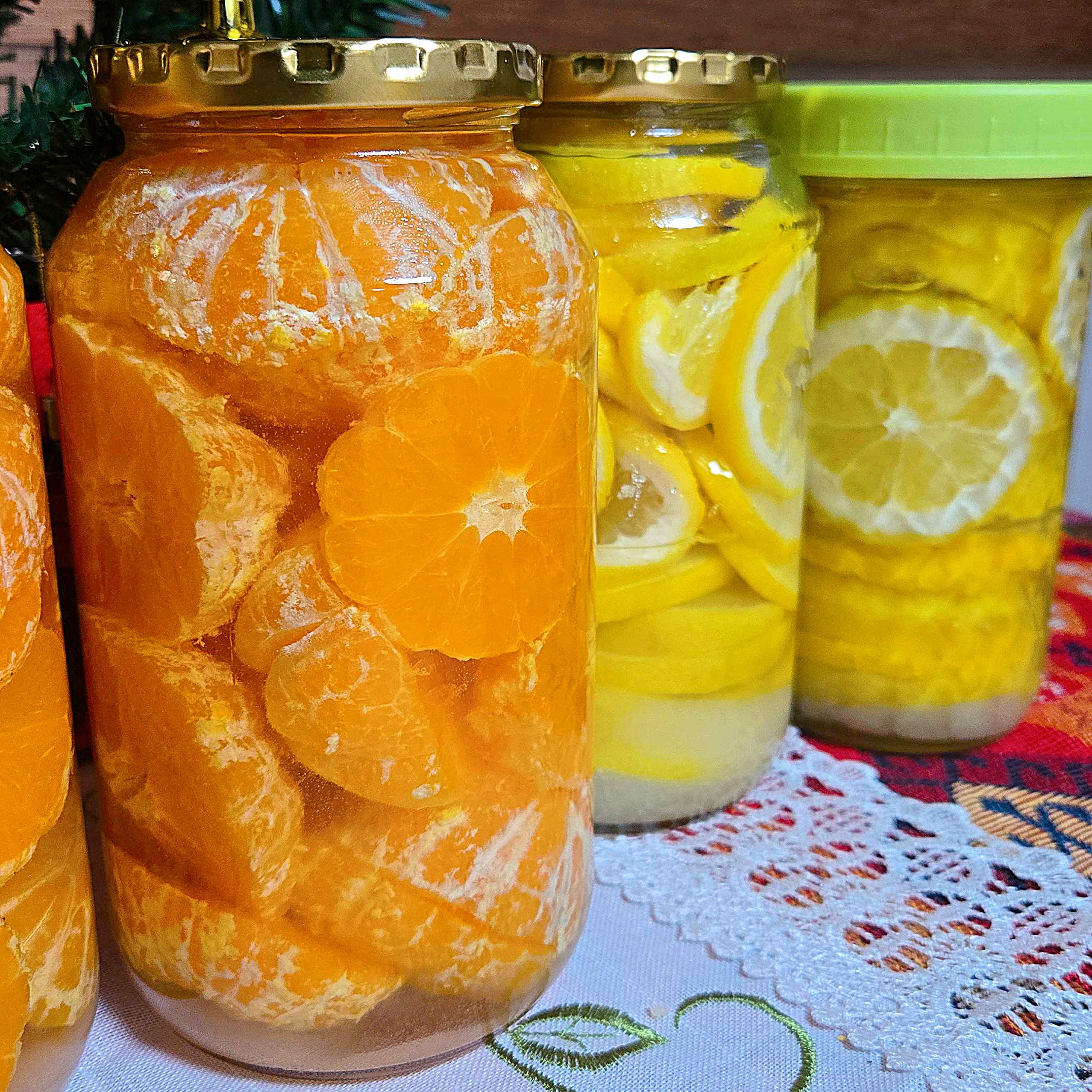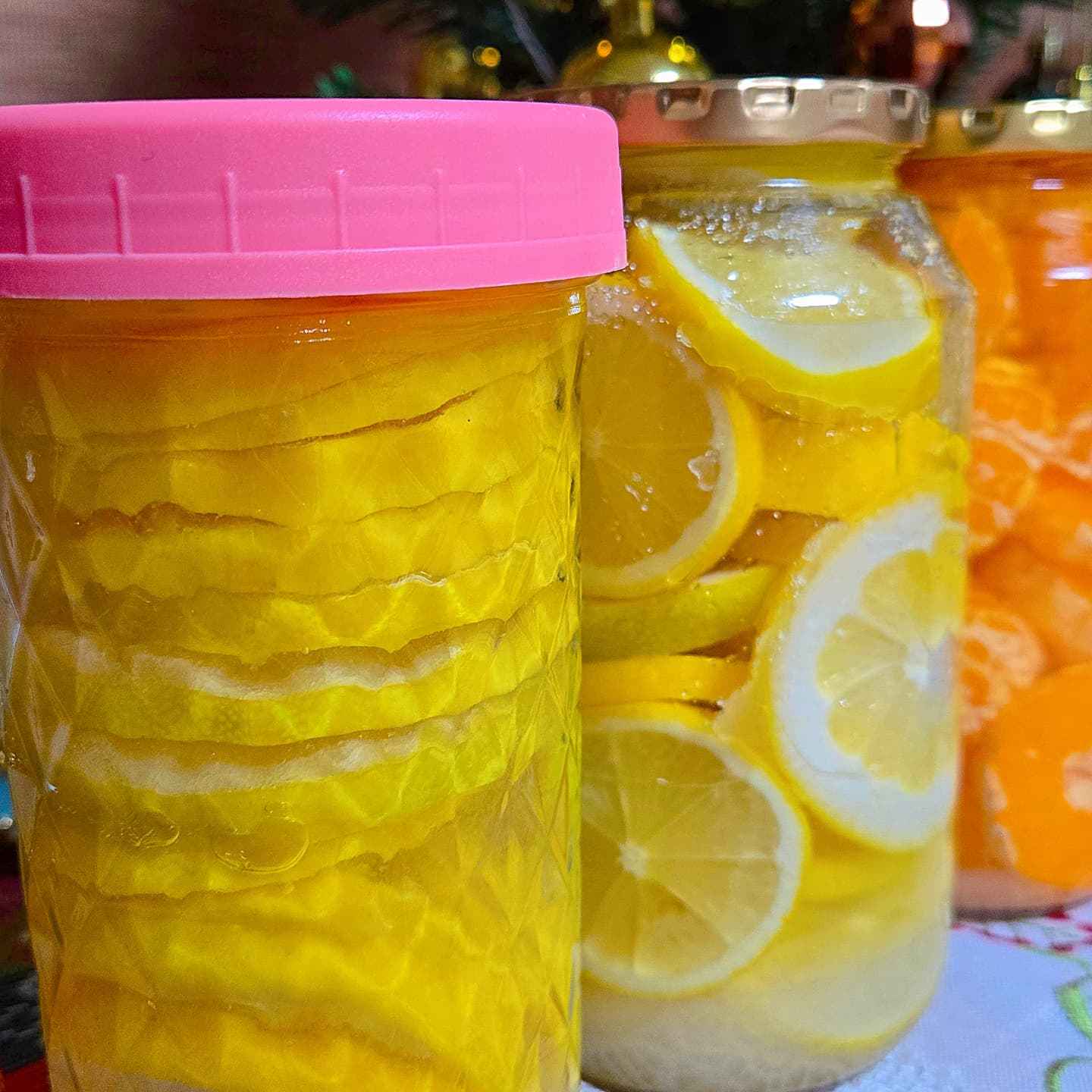 짠! 왼쪽부터 레몬 담금주, 레몬청, 귤 담금주 X2, 레몬청, 레몬 담금주 에요!