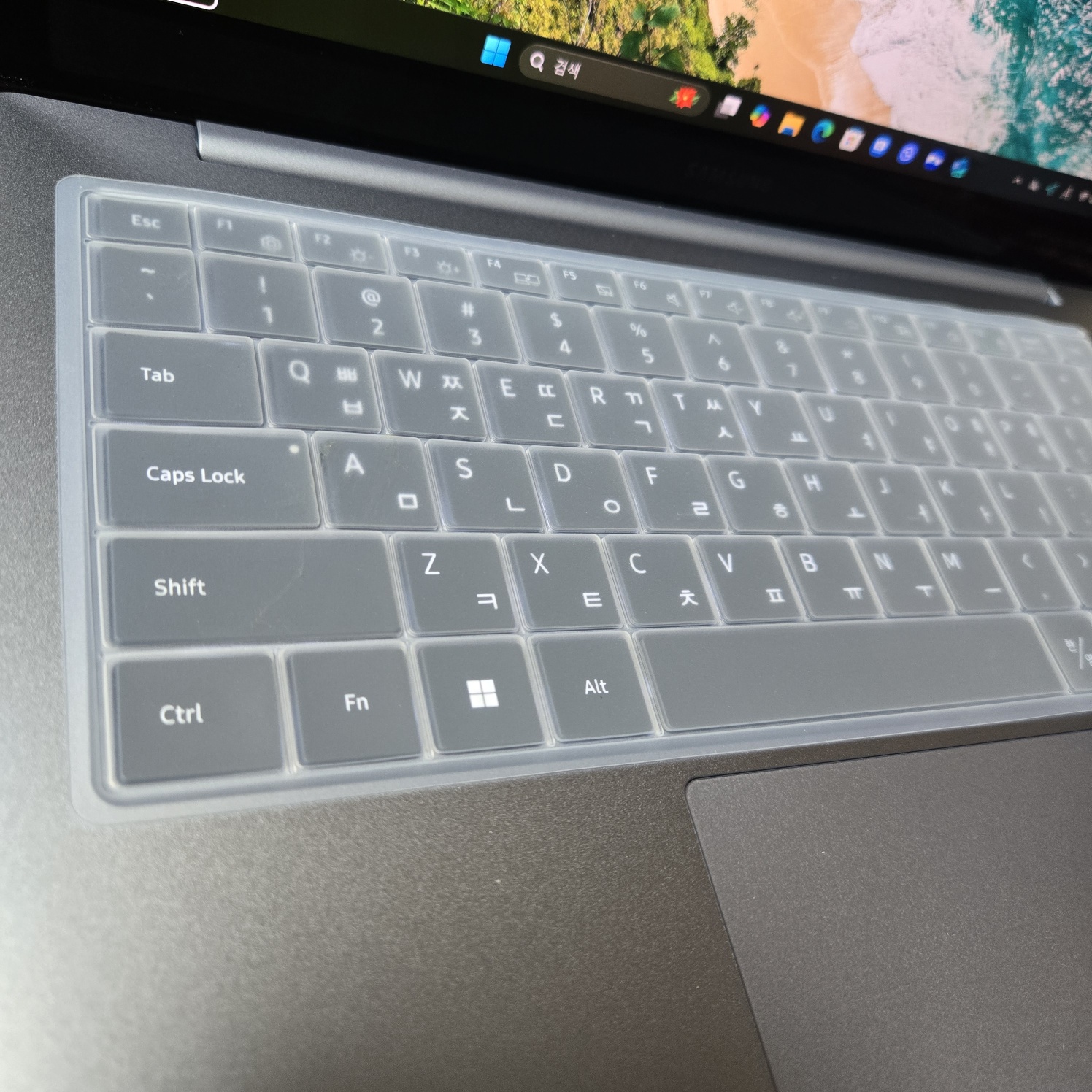 키보드 덮개를 벗기고 씌운 모습입니다. 엣지라서 키보드가 좁을 줄 알았는데 생각보다 널찍해서 오타가 날 염려는 안 해도 될 것 같더라고요. 은은한 푸른빛이 겉 색감과 어우러져 동떨어지지 않고 참 예쁘다고 생각했습니다.
